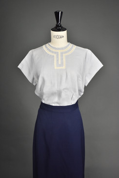 It is the prettiest light blue, with a sheer cutout design at the neckline. The sheer fabric is outlined with delicate white glass seed beads.